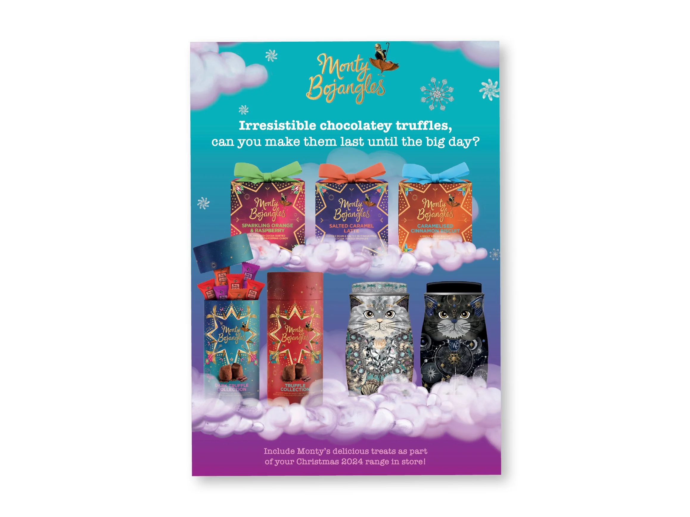 Monty Bojangles is a London based UK confectionery brand famous for its curiously moreish award winning cocoa dusted truffles. Working alongside the in-house marketing team, I created a range of trade averts to promote their products for Christmas 2024.